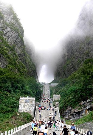 選擇乘索道游覽天門山是最佳視角。索道吊廂一出站房,馬上就騰空飛了起來(lái),從城市的一棟棟樓頂掠過(guò),猶如在城市上空滑翔。翻過(guò)一道山梁之后,城市被遠(yuǎn)遠(yuǎn)拋在了視線以外,大片翠綠的稻田映入眼簾,透過(guò)打開的通風(fēng)窗口,一陣陣青草水田特有的清香沁入心脾;蚋呋虻偷霓r(nóng)舍不時(shí)從我們身下滑過(guò),牛羊們?nèi)齼蓛捎崎e的在田間浮動(dòng)著,靜謐、安詳。再翻過(guò)一座山峰,我們便立即被滿山的青翠所包圍,萬(wàn)仞絕壁也已投懷送抱。索道支架矗立于絕壁天險(xiǎn)中,或挺立或傾倒或探頭或擁抱,我們繼續(xù)在艱險(xiǎn)中游歷,時(shí)而隱沒(méi)于云堆,時(shí)而出世于蒼穹。這時(shí)你除了那滿懷的驚險(xiǎn)刺激外有的便只有望索而興嘆了。我拍了很多片子,但是總覺(jué)得還是沒(méi)有足以記錄下來(lái)這座空中盆景的壯麗。