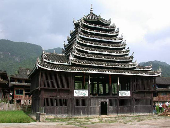位于通道侗族自治縣坪陽(yáng)鄉(xiāng)田心寨境內(nèi),始建于清順治年間,為侗族獨(dú)特建筑。方形二層樓閣,九層八柱,木結(jié)構(gòu)。邊寬8米,高20米。頂蓋為八角形,上托葫蘆寶頂。封檐板與樓內(nèi)大梁彩繪民間圖畫,各檐翹角飾禽獸浮雕。底層設(shè)火塘,四周置木凳。二樓正面系活動(dòng)板壁,可兼做戲臺(tái)。