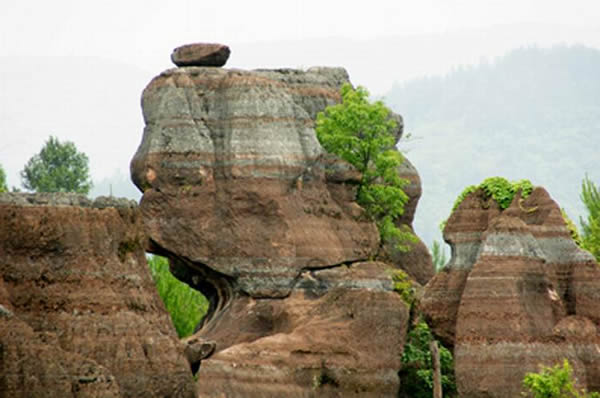 紅石林 告別船工后一切便突然安靜下來,過山谷的小路沒有人家,偶爾傳來幾聲清脆的鳥叫。穿過幾座隘口,峰回路轉(zhuǎn)后“石林”漸漸露臉,石頭的顏色是由灰白到棕紅,變幻而又使人聯(lián)想。間或一棵參天大樹,或是綠竹三兩棵,則又是另一番景致了。于高于低、于肥于瘦的石林,于石于樹、于濃于淡的色彩,顯得雄奇又雋秀,并透露出一種清靈飄逸。 這些石柱不但顏色各異,而且大小不等。有的高達七、八米,而有些則像半埋于地下的巨獸骨架。一位村民告訴記者,現(xiàn)在石林沒有以前壯觀,都長渣子(灌木)了。原因是由于山頂樹木減少,雨水將泥土帶下山,很多石頭都被埋在土下,后來這些地方都開墾了農(nóng)田,石林也被永久覆蓋。 由于泥土覆蓋,石林被切割成一個個小區(qū)域,有些隱蔽在果林中,而有些則像突然從天而降,散落田間。