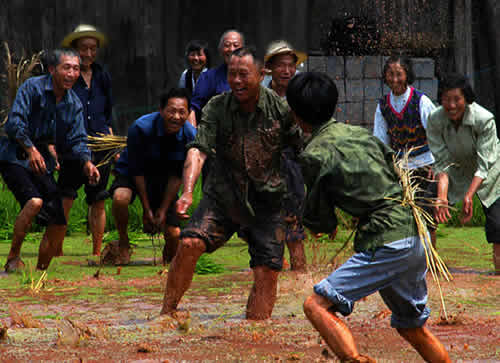 插秧活動(dòng)的最后一天,叫做“關(guān)秧門”。一丘田里,聚集了很多幫忙插秧的人,大家心里都憋著一股勁,看誰秧插得最快。速度慢人往往會(huì)被插得快的人圍住,最后關(guān)在秧田中間出不來,這叫“關(guān)豬籠”。這時(shí)候,速度快的人就會(huì)走上田埂,抓起稀泥團(tuán)朝被關(guān)了豬籠的人扔去,也有專門砸主人一身稀泥的,岸上也有人澆水。主人身上被砸的稀泥越多,主人越高興。在關(guān)秧門的最后時(shí)刻,人們會(huì)在田野里上演一場(chǎng)你追我趕的游戲,土家人把它叫做“糊倉”。在“糊倉”的過程中,誰也不會(huì)記仇,大家你追我趕,場(chǎng)面極其熱鬧。