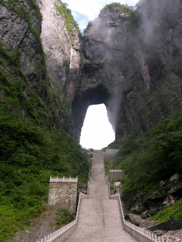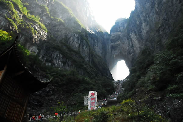 天門洞風(fēng)光圖片 天門洞景觀 1700多年來,這一道奇絕天下的勝景吸引著無數(shù)的探訪者趨之若鶩。特別是在1999年,世界特技飛行大師駕機(jī)穿越天門洞,在全球引發(fā)了轟動(dòng)效應(yīng),收看現(xiàn)場(chǎng)直播的觀眾達(dá)到8億之多。
