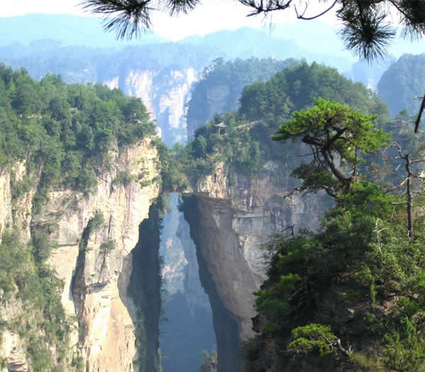 天下第一橋圖片 在砂刀溝盡頭右側(cè),袁家界左面南沿,一天然石橋凌空飛駕于兩座巨大的石峰之巔,厚約4米,寬2米余,跨度約50米,相對(duì)高度400多米。橋面兩端石峰上,綠樹叢簇,郁郁蔥蔥,峰壁則宛若斧劈,草木不生。立橋邊俯視,透過稀疏樹葉,見云涌霧蒸,幽深莫測(cè)。自北端步行過橋,狹窄處僅數(shù)十厘米,心驚卻步。繞過深谷,站在相距40多米處觀橋臺(tái)上,橋的全貌映入眼簾,橋身雄奇?zhèn)グ丁?