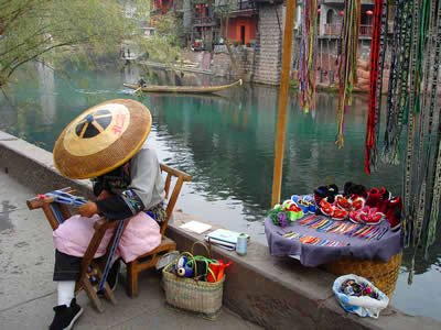 刺繡 刺繡。是土家姑娘在直紋平布上,按照布紋的經(jīng)緯和預(yù)先繪畫(huà)的花樣與底色不同的絲線繡成圖案。舊時(shí)姑娘們穿的繡花衣服,繡有服飾花邊、胸花、帽花,此外繡花枕頭、繡花荷包等也是精巧的手工工藝品。土家刺繡在配色上有自己的講究與習(xí)慣,一般選用青、藍(lán)、大紅等深色布料作底布,用淺色繡線制作圖案,或者相反,兩種用法的結(jié)果使繡品顯得質(zhì)樸逼真,色澤鮮艷,對(duì)比強(qiáng)烈。傳統(tǒng)圖案有“花開(kāi)富貴”、“龍鳳呈祥”、“鴛鴦戲水”、“喜鵲鬧梅”、“松鶴同壽”等,分室內(nèi)、衣著、工具、行李裝飾等多種種類(lèi)。在景區(qū),土家婦女邊繡邊賣(mài)的精美鞋墊,深受海內(nèi)外游客喜愛(ài)。