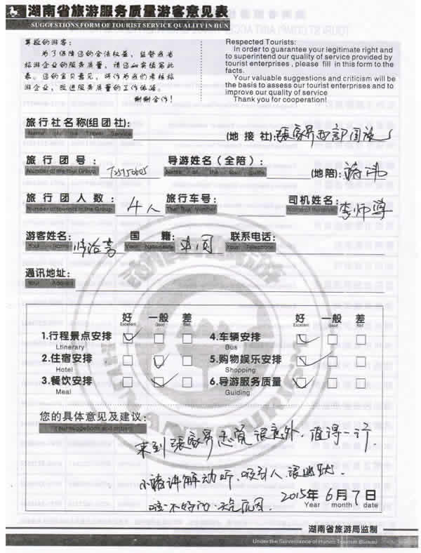 5月下旬,上海張女士一行四位貴賓與湖南西部(張家界)中國國際旅行社工作人員——龔玲取得聯(lián)系,經(jīng)過商談,雙方達成協(xié)議并簽訂旅游合同,于6月4日抵達張家界,開始張家界之旅。此次行程是由我社優(yōu)秀導(dǎo)游——褚偉,負責旅游接待工作,褚導(dǎo)在旅游過程中講解詳細,客人也很滿意,在意見表上寫到:來到張家界感覺很意外,值得一行,小褚講解動聽,吸引人,很幽默!同時也感謝張女士選擇湖南西部(張家界)中國國際旅行社,以及您對湖南西部國旅的信任與支持。我們會繼續(xù)努力,做好旅游接待工作。期待下一次與您的合作,祝您愉快!