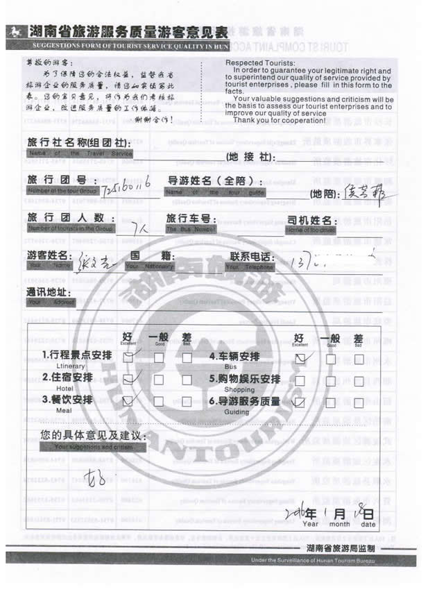 1月份,長(zhǎng)沙張女士一行7位貴賓與湖南西部(張家界)中國(guó)國(guó)際旅行社工作人員——張群取得聯(lián)系,經(jīng)過(guò)商談,雙方達(dá)成協(xié)議并簽訂旅游合同,于1月16日抵達(dá)張家界,開(kāi)始張家界之旅。此次行程是由我社優(yōu)秀導(dǎo)游——侯芳菲負(fù)責(zé)旅游接待工作,侯在旅游過(guò)程中講解詳細(xì),客人也很滿意。同時(shí)也感謝張女士一行貴賓選擇湖南西部(張家界)中國(guó)國(guó)際旅行社,以及您對(duì)湖南西部國(guó)旅的信任與支持。我們會(huì)繼續(xù)努力,做好旅游接待工作。期待下一次與您的合作,祝您愉快!