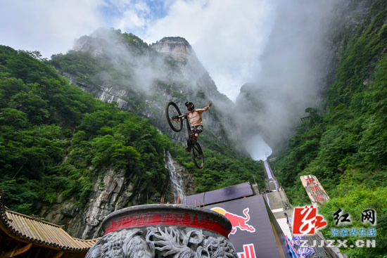 張家界天門山天梯速降賽即將拉開帷幕,7月14日,來自不同國家的14名選手齊聚天門山999級臺階進行適應場地訓練。選手們在空中做出各種翻滾特技動作,引來游人尖叫不斷。